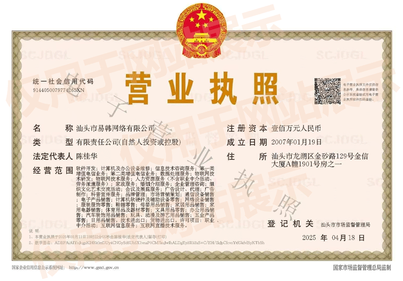 汕頭市易韓網(wǎng)絡(luò)有限公司營業(yè)執(zhí)照: