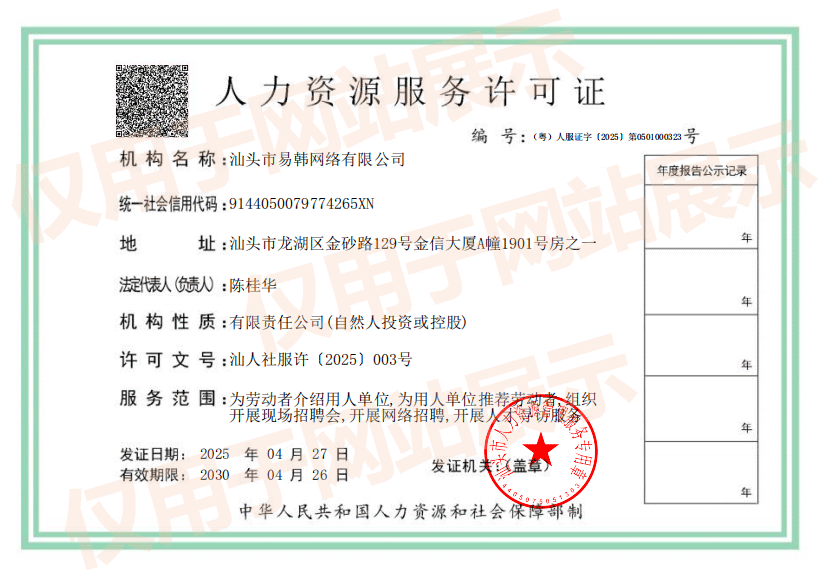 汕頭市易韓網(wǎng)絡(luò)有限公司人力資源服務(wù)許可證