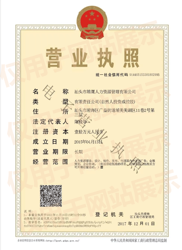 汕頭市雄鷹人力資源管理有限公司營業(yè)執(zhí)照